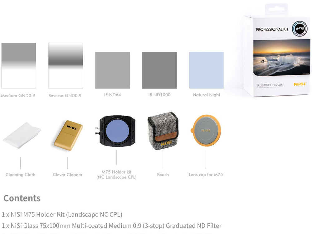 The NiSi M75 professional kit is a premium package that has been designed to cater for your landscape and seascape photography needs. It's equipped with everything you need to get started. Incredibly, it's the perfect kit for users embarking on long exposure imaging. It comes with ND filters and GND filters that can function perfectly with multiple lenses, accommodating sizes up to 67mm with a standard filter thread.