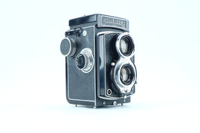 The Rolleicord DBP DBGM is a precision-built twin-lens reflex camera manufactured by Franke & Heidecke in Braunschweig, Germany. This model belongs to the later Rolleicord V series, known for its robust design, bright focusing screen, and excellent Schneider-Kreuznach optics. The pairing of a Heidosmat 75mm f/3.2 viewing lens and a Schneider-Kreuznach Xenar 75mm f/3.5 taking lens delivers outstanding sharpness and beautiful vintage rendering, making it one of the most desirable Rolleicord combinations.
