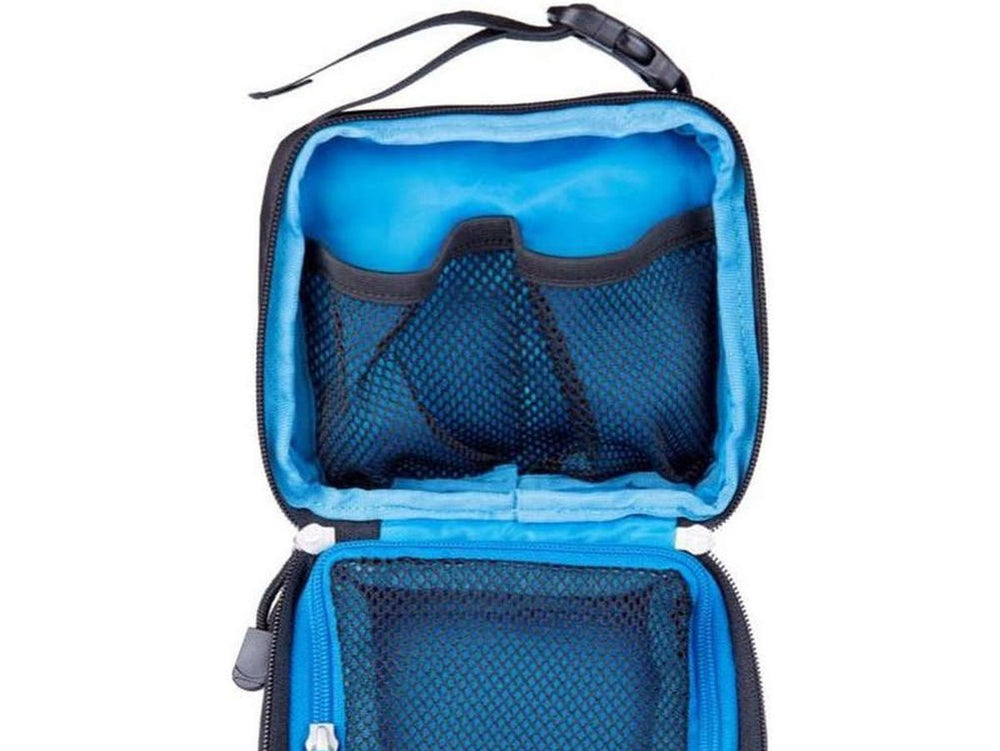Dimensions of the pouch are 14 cm in length, 13 cm in height, and 7 cm in depth, combining practicality with style. The interior features a refreshing blue hue, while the sleek exterior showcases a sophisticated blend of grey and black.