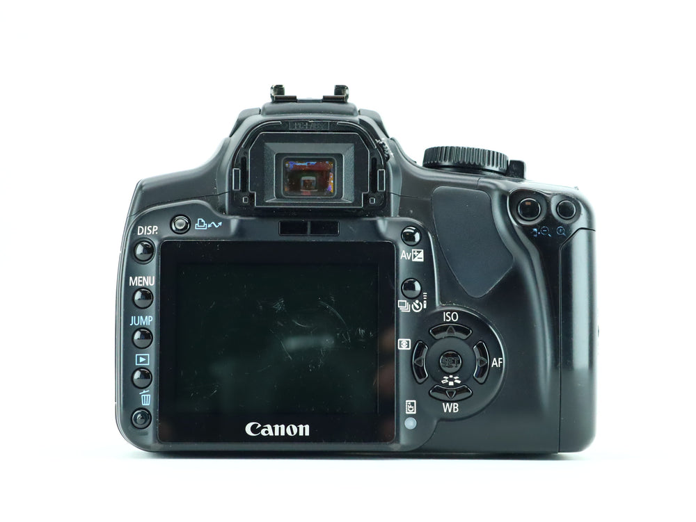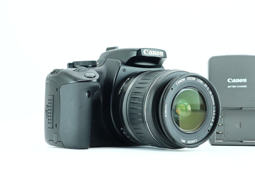 The Canon EOS 400D is a reliable and user-friendly DSLR, perfect for beginners and enthusiasts alike. Paired with the Canon EF-S 18-55mm f/3.5-5.6 zoom lens, this kit offers versatility for a wide range of photography styles, from landscapes to portraits. The camera features a 10.1 MP APS-C sensor, ensuring high-quality images with great detail and color accuracy. Its intuitive interface and lightweight design make it a great option for those stepping into the world of digital photography.