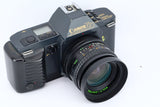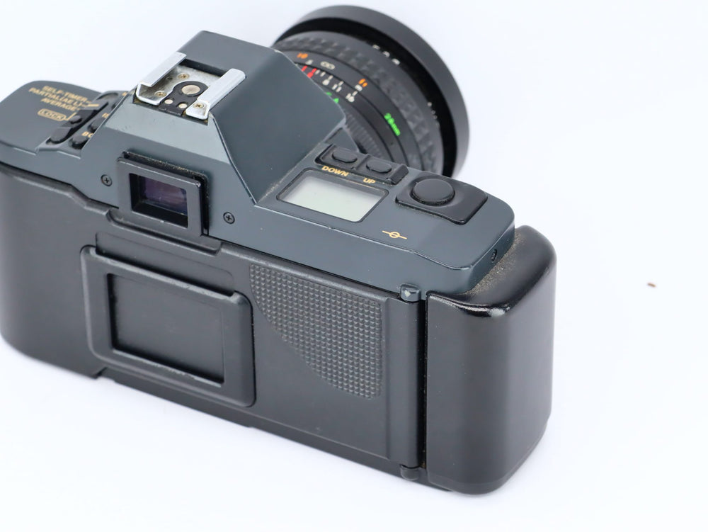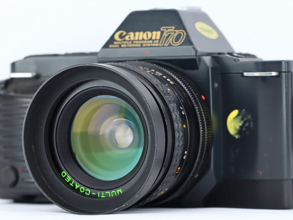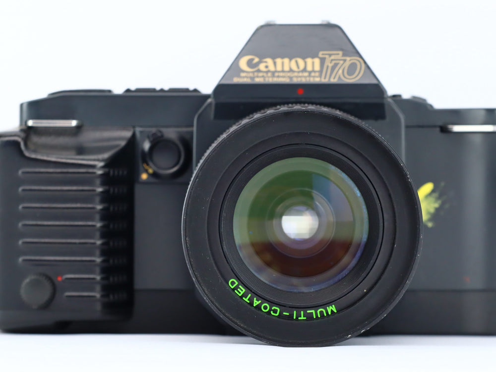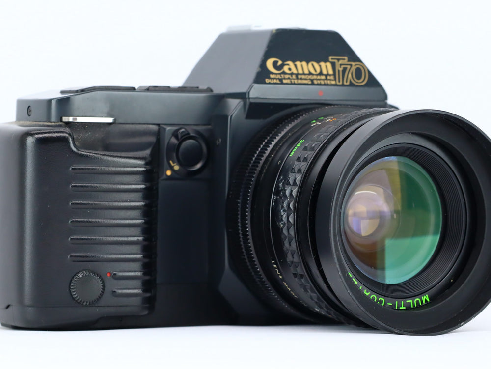 The Canon T70 was a 35mm FD-mount single-lens reflex camera introduced in April 1984 as the second in Canon's T series. The T70 started with the concepts explored in 1983's T50, took them further, and applied them to a more sophisticated camera. While the Program AE-only T50 was intended as a beginner's camera, the T70 gave the photographer a lot more control over the camera's operation while keeping the T-series philosophy of simplicity in control and operation intact.