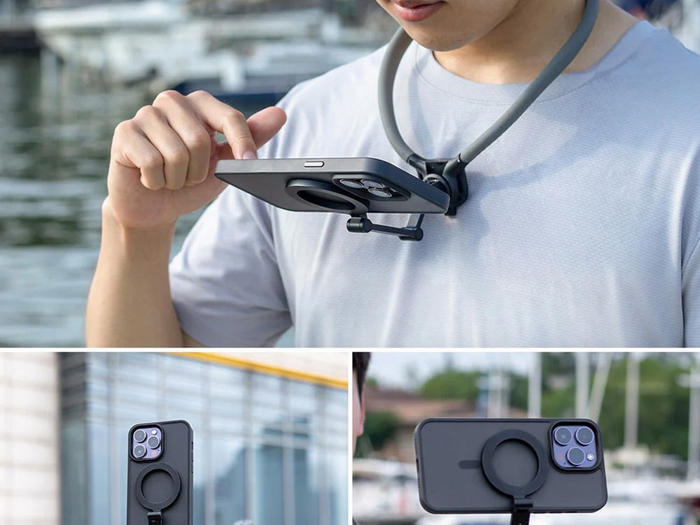 The mount is ingeniously constructed from stainless steel neck tubing and aluminum that flexibly bends at any point, ensuring comfort in wearability. With the MagSafe system, you can effortlessly connect your smartphone thanks to a vertical force of 30N, offering stable and secure recording. The package comes complete with an ultra-thin magnetic ring, making this mount suitable for both Apple and Android devices.