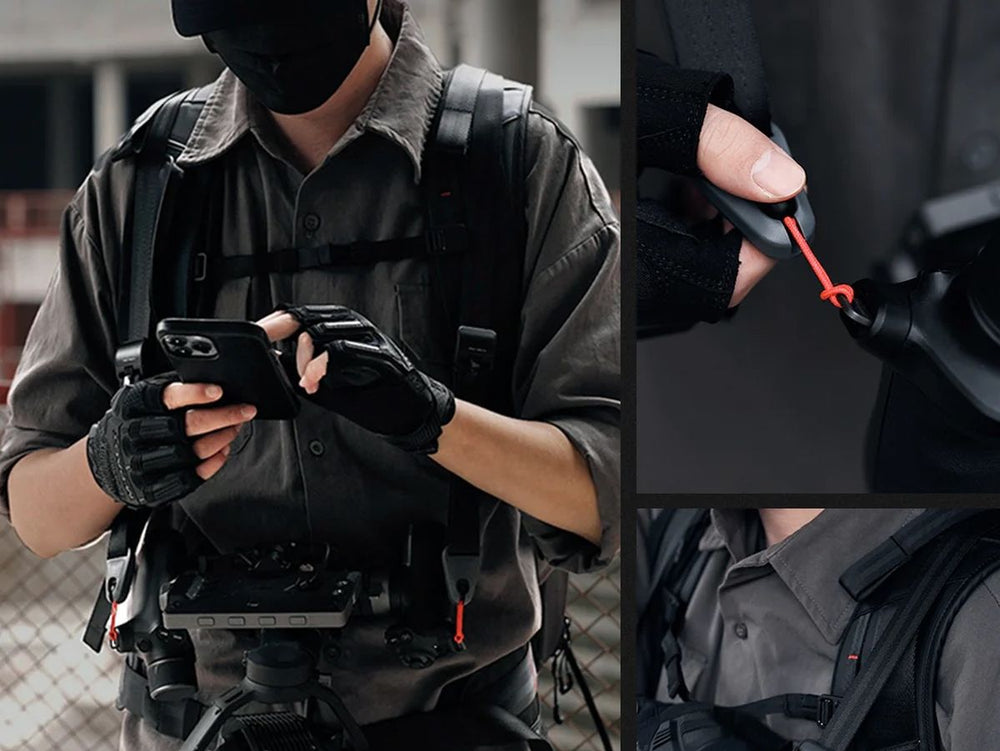 Enhancing its functionality, this robust backpack comes with an adjustable camera strap and quick-release mechanisms, letting you comfortably hang the gimbal camera at your chest level, ensuring you're always ready to capture the perfect shots. Its user-centric design features comfortable shoulder straps and an ergonomic shape for prolonged use without fatigue.