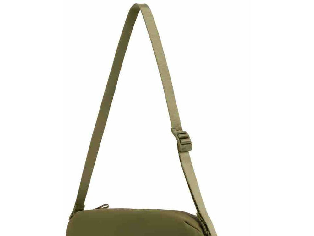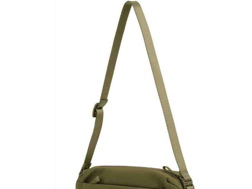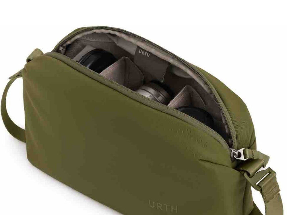 The Urth Dolomite Green Camera Sling boasts a minimalist, weather-resistant exterior crafted from recycled nylon. Its lightly cushioned interior, made from recycled polyester, offers a flexible capacity tailored to your photographic equipment needs. The bag's design features interior and exterior zippered compartments, providing secure and easily accessible storage for small items like keys and memory cards. A shoulder strap, detached and adjustable between 700 and 1250 mm, provides versatility in wearing options - it can be worn across the body or over the shoulder.