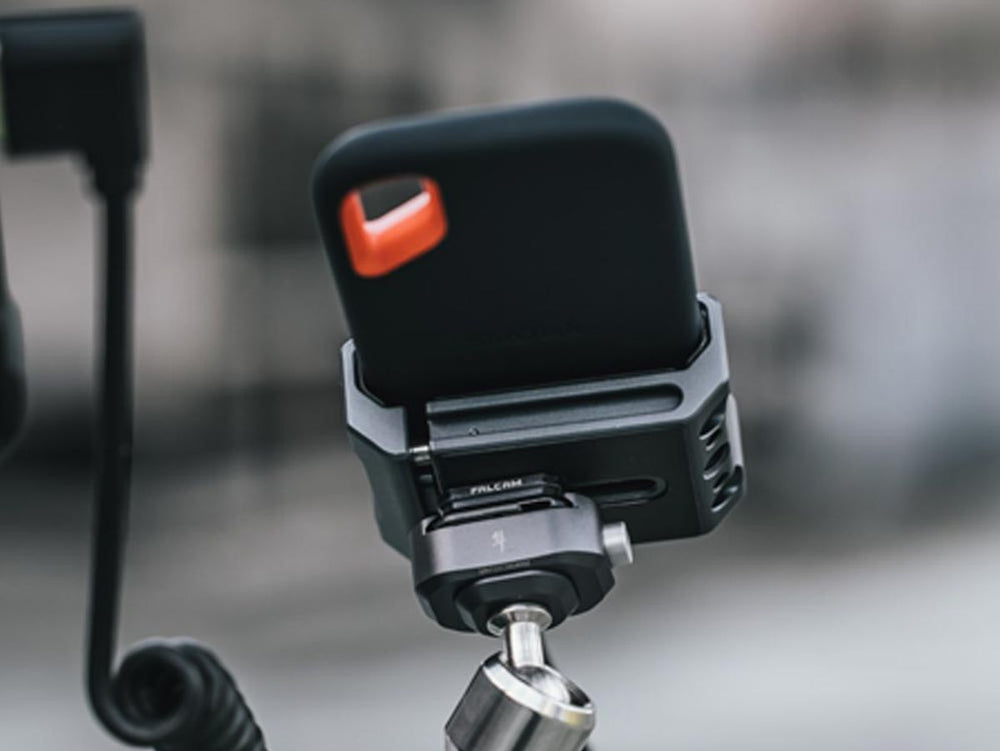 The Falcam Universal SSD Holder provides a convenient way to integrate an SSD drive into your setup. It easily attaches to a camera cage using a 1/4" threaded hole or a cold shoe mount, enhancing your filming or photography rig.