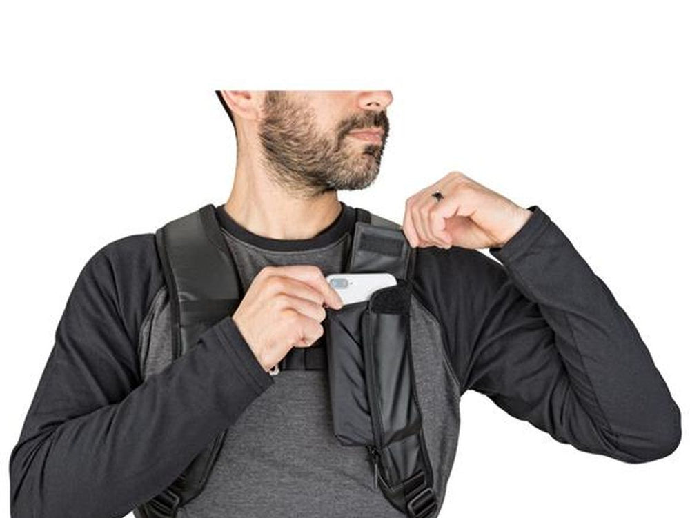 With the FreeLine 350 bag, you'll find ample space to fit a comprehensive range of camera gear including lenses and flash, along with a 15-inch laptop or tablet. Side pockets equipped with zippers accommodate memory cards and small accessories securely. The backpack additionally includes provisions to attach your tripod at the front using designated straps. A useful feature is a pocket on one of the shoulder straps, specifically designed for storing your smartphone.