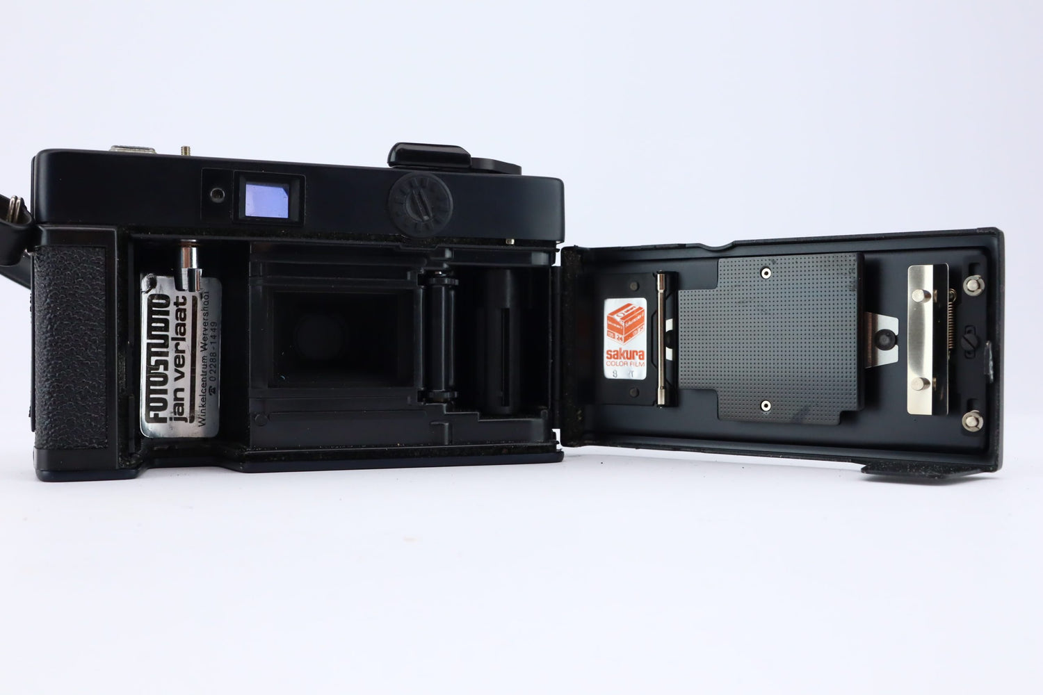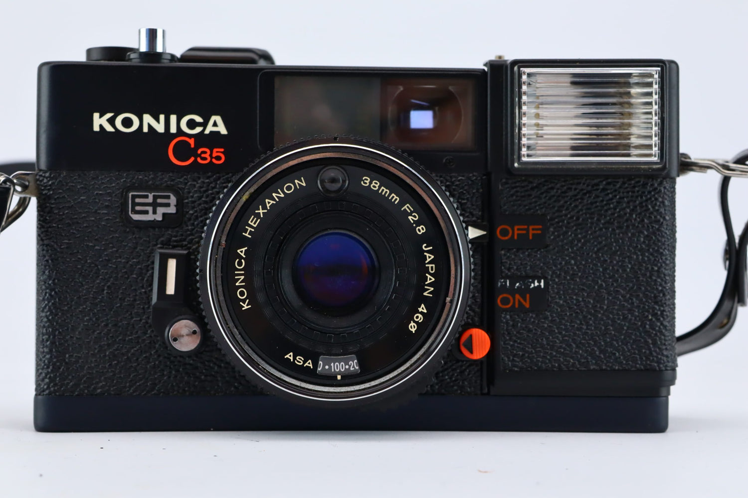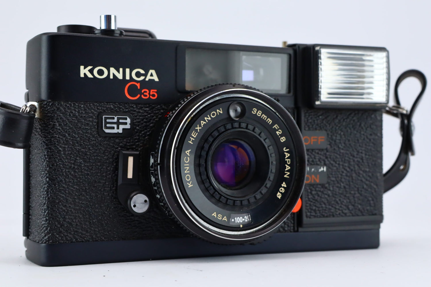 The Konica C35 EF is a 35mm point and shoot camera and is equipped with a built-in flash and uses a Japanese Hexanon 38mm F4 lens. Below The lens the ISO settings can be adjusted. it is a great camera for starters and travel photographers. it comes with a neck strap and its original bag.