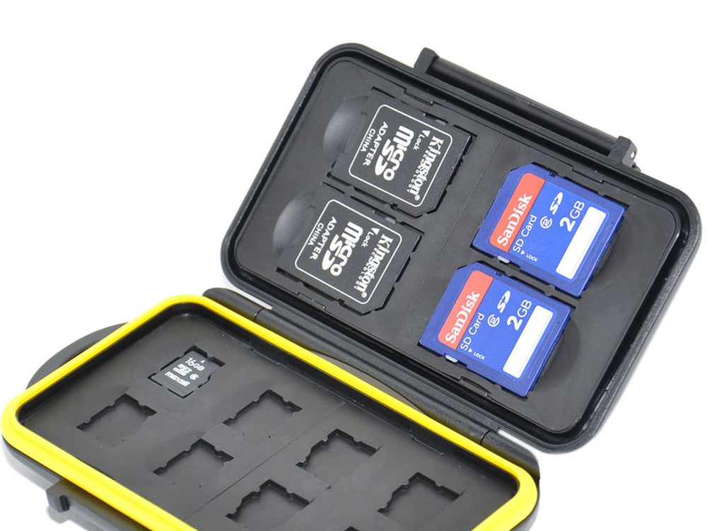 The JJC MC-SDMSD12 Multi-Card Case is a solid, splash-resistant memory card case that accommodates 4 SD and 8 MicroSD cards. It's equipped with a molded rubber interior designed to absorb any potential shocks. This feature also ensures that your memory cards remain firmly in position even when you store the case inside your bag.