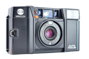 A compact autofocus camera released around 1984, the Minolta AF-S is basically an AF-Sv (Talker) without the voice chip (or the other way around), with the other difference being a blue line on the right side instead of a red line. Having an integrated flash, it is slightly larger than the ultra-compact AF-C with its flash attached. The lens is a 35 mm ƒ/2,8. The built-in pop-up flash is manually activated using a slider on the back.