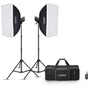 - Featuring 60cm x 90cm softboxes, perfect for portrait and product photography.