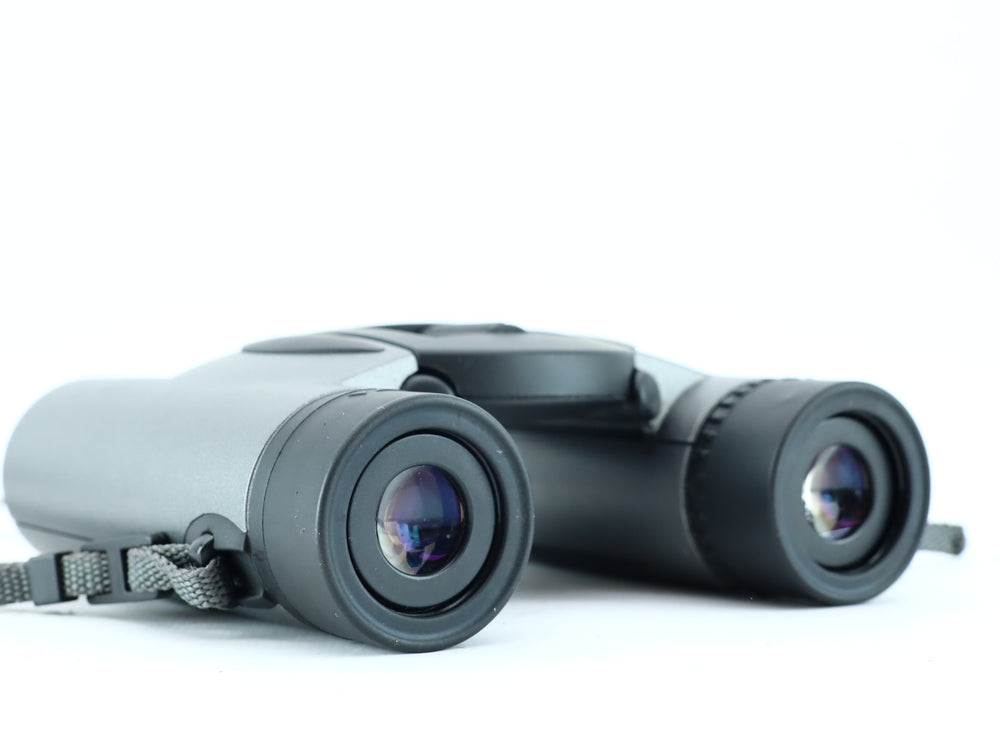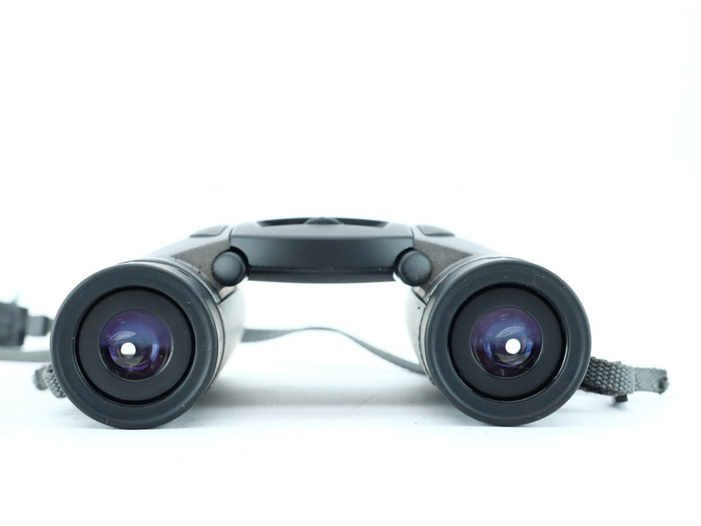 The binoculars show light signs of use. Optics are clear, focus wheel turns smoothly, and alignment is correct. Rubber armor is intact. A reliable, travel-ready pair of binoculars.