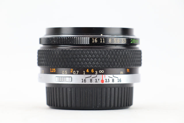 Product Information: The Olympus OM 28mm f/3.5 is renowned for its ability to deliver sharp images with minimal distortion, making it a favorite among photographers who need a reliable wide-angle lens. The lens's compact size makes it highly portable, and its durable construction ensures it will stand up to regular use. Whether you're capturing vast landscapes or bustling city streets, the Olympus OM 28mm f/3.5 offers the quality and reliability you need to get the shot.