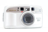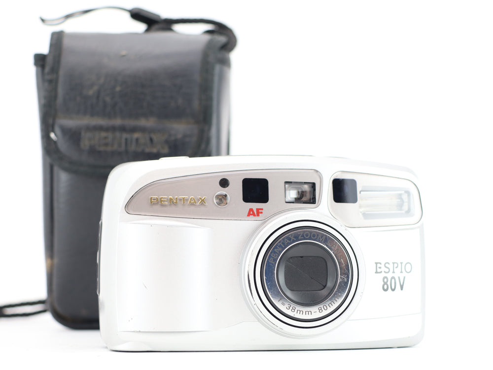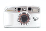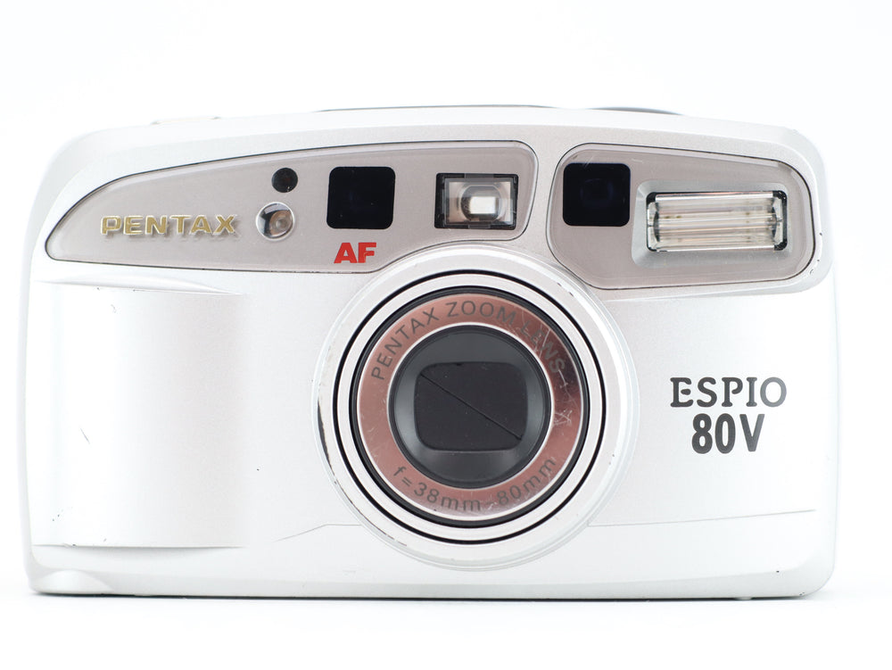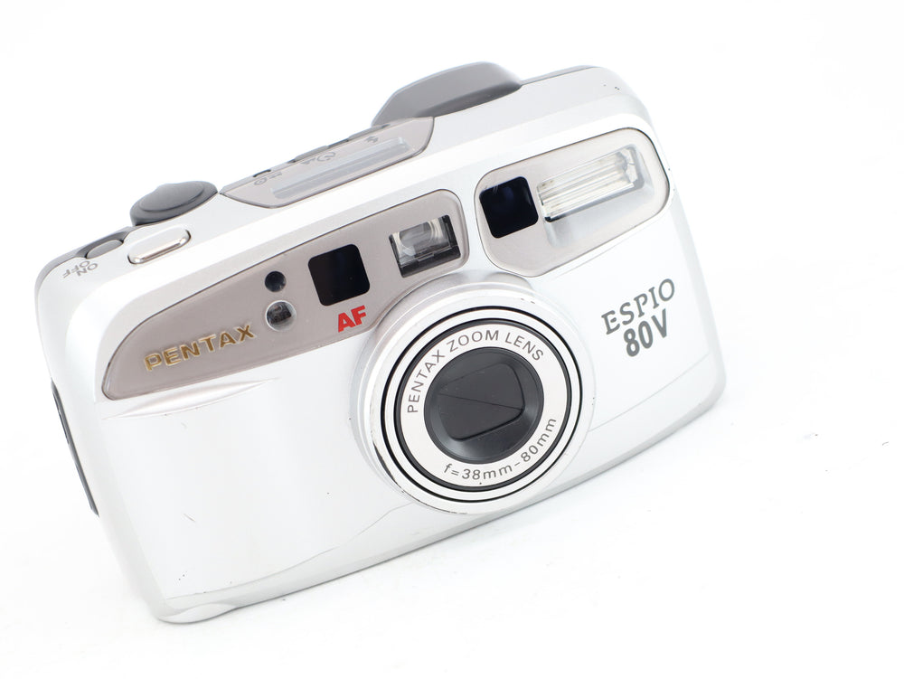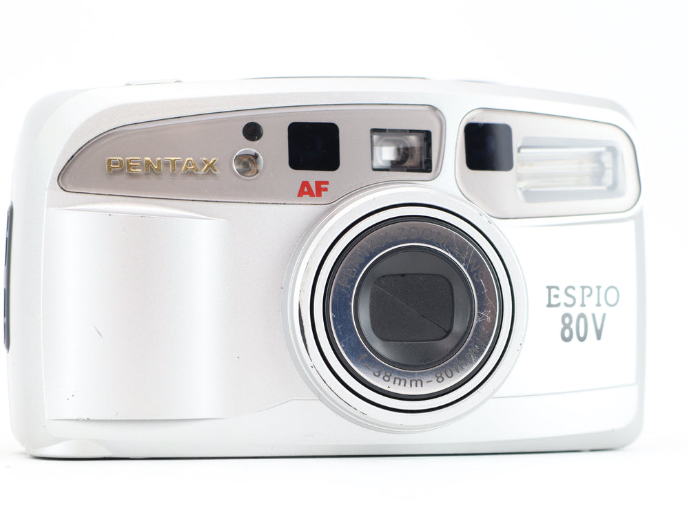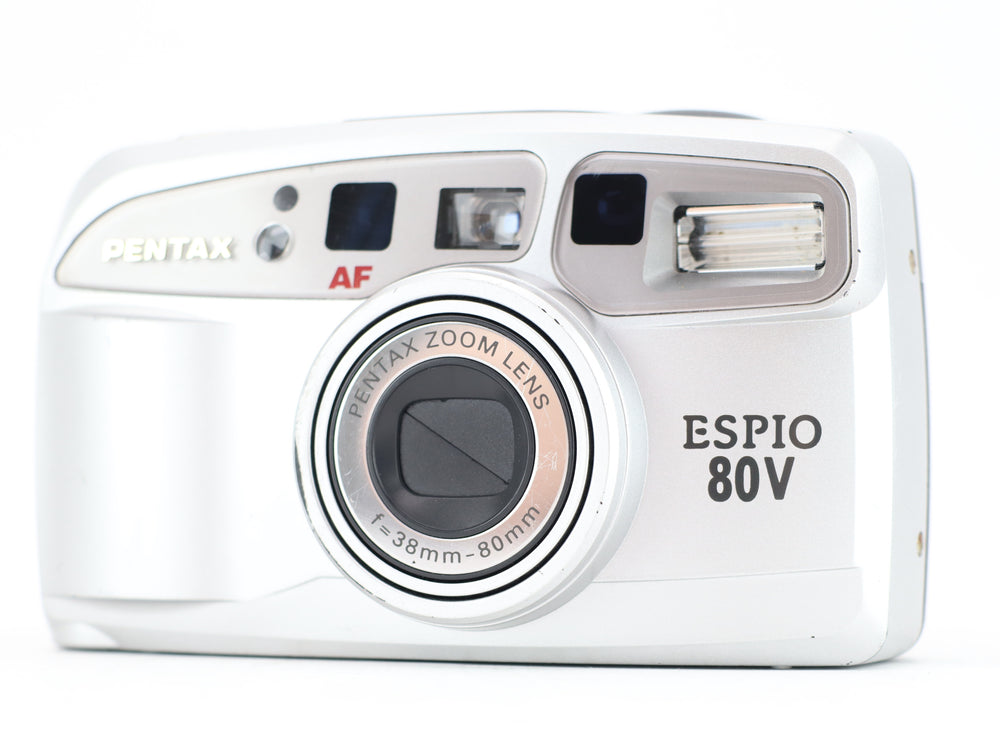 The Pentax Espio 80V is a compact 35mm film camera, ideal for everyday photography. With its versatile 38-80mm zoom lens, this camera is perfect for capturing a variety of subjects, from wide-angle landscapes to closer portraits. Its compact design and easy-to-use features make it a great choice for both novice and experienced photographers who want a reliable and portable film camera.