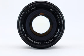 The Petri C.C. Auto 55 mm f/ 1.8 is a fast standard multi-coated lens, with the m42 screw mount. It is a sturdy lens with an amazingly strong build quality and has a sharp picture quality. It is useable for all kinds of photography from landscape to portraits. it does not come with the lens caps.