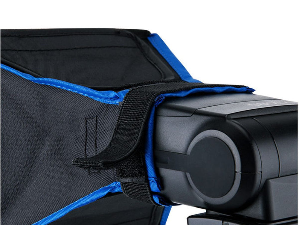 This rectangular softbox effectively diffuses light to minimize harsh shadows and offers a secure fit due to its elastic Velcro closure and non-slip edge, ensuring stability when attached to a flash unit.