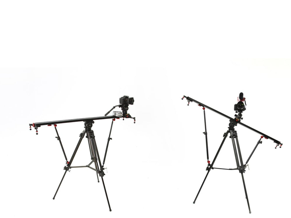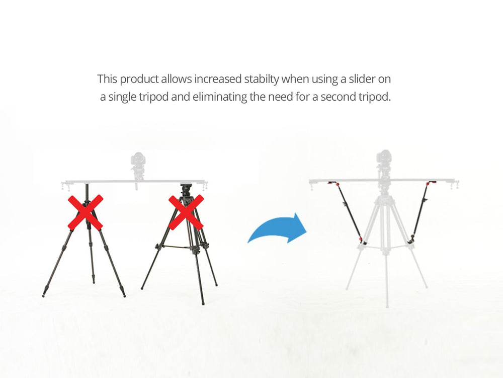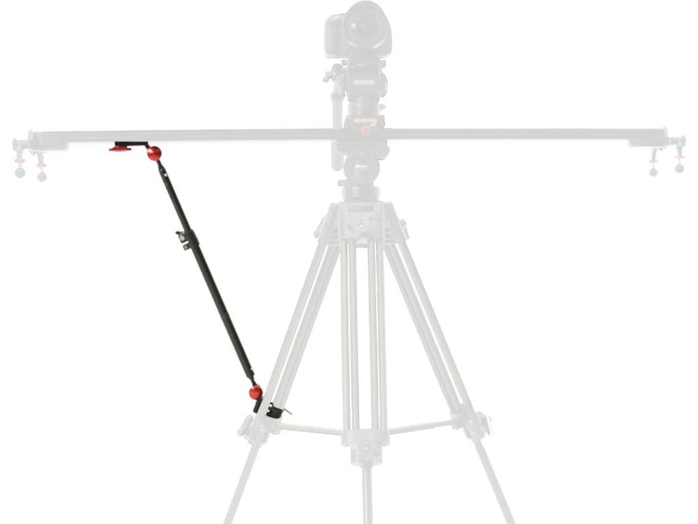 The Konova Tripod Stability Arm enhances the stability of your slider when it's mounted on a single tripod. The device clamps onto one of the tripod's legs at one end and attaches to your slider at the other end using a 1/4"-20 thumb screw. Thanks to its extendable design and adjustable angles, you have the freedom to position your slider in various ways, whether level or at an angle. It's worth mentioning that a single arm can offer sufficient stability. However, we recommend using a second arm for more complex set-ups, such as when positioning the slider diagonally.