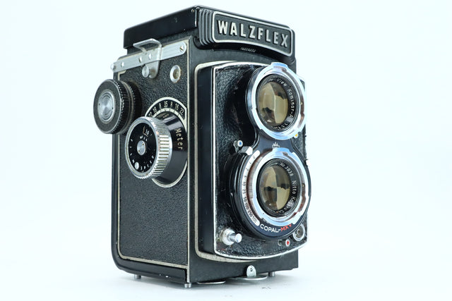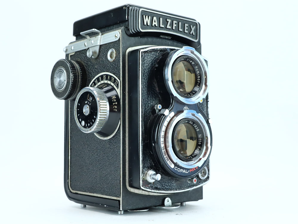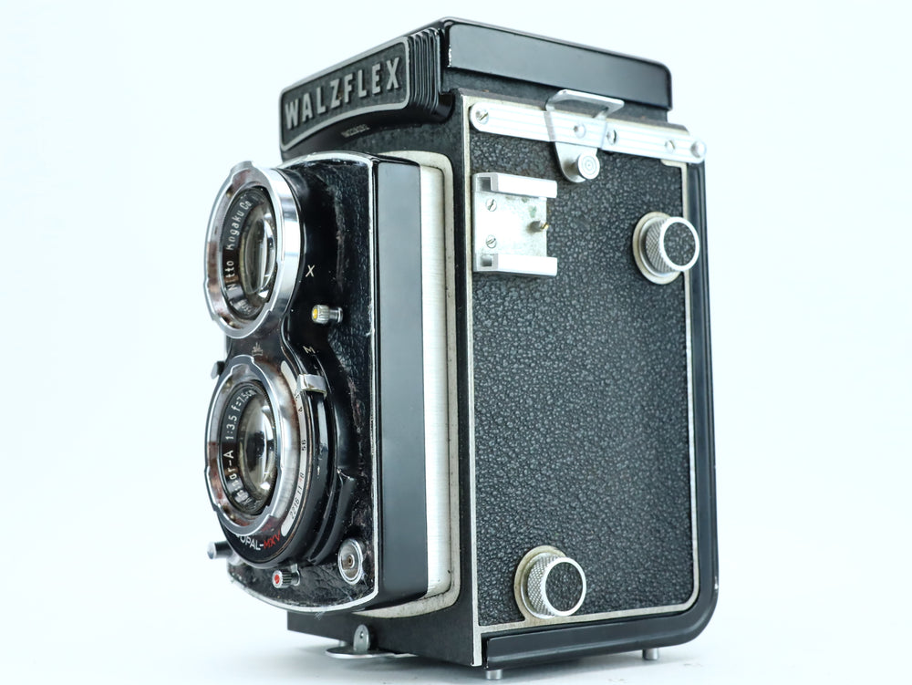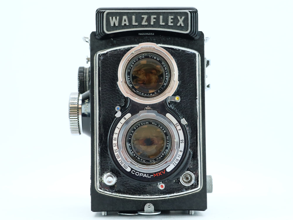 The Walzflex is a 1950s Japanese twin-lens reflex (TLR) camera, offering classic medium format performance in a compact and elegant design. This model features a Kominar 75mm f/3.5 taking lens made by Nitto Kogaku Co., paired with a Copal-MXV leaf shutter, known for reliability and accurate speeds.