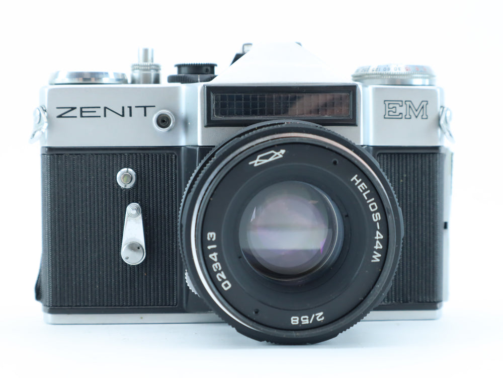 The Zenit EM is a robust, fully manual 35mm film SLR camera produced by KMZ in the USSR during the 1970s. Built like a tank, it features a simple, mechanical design with a metal focal-plane shutter and TTL light metering. This kit includes the highly regarded Helios-44M 58mm f/2 lens, famous for its distinctive swirly bokeh and excellent sharpness.